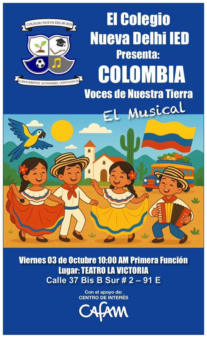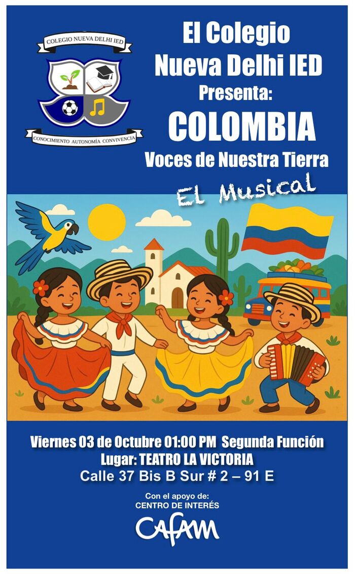 El Colegio Nueva Delhi IED de la localidad de San Cristóbal los invita cordialmente al Teatro La Victoria el viernes 3 de octubre en dos funciones que reunirán la cultura y folklore colombiano en un musical que mostrará el talento de los estudiantes así como su fortalecimiento en las habilidades artísticas.