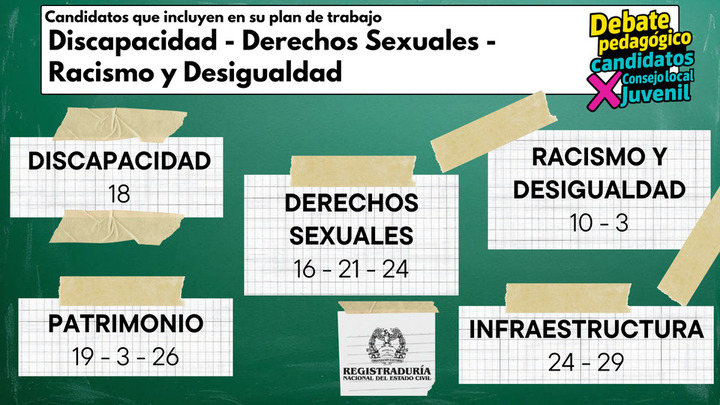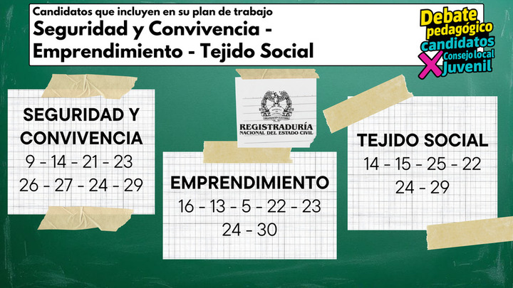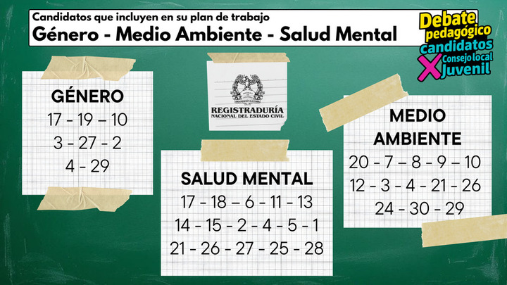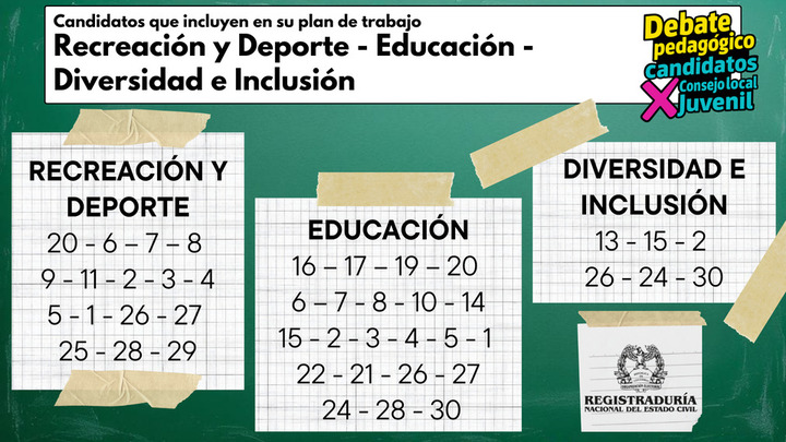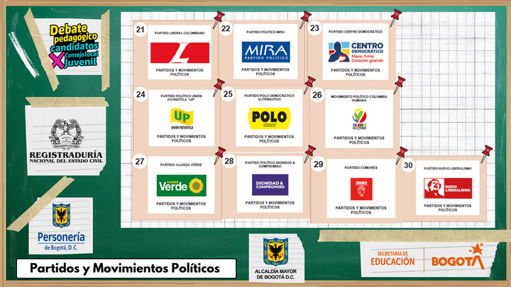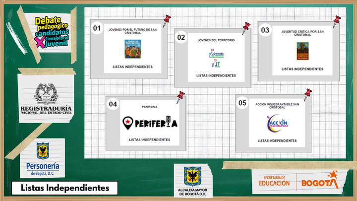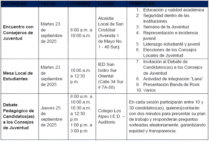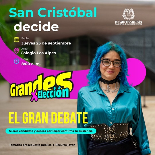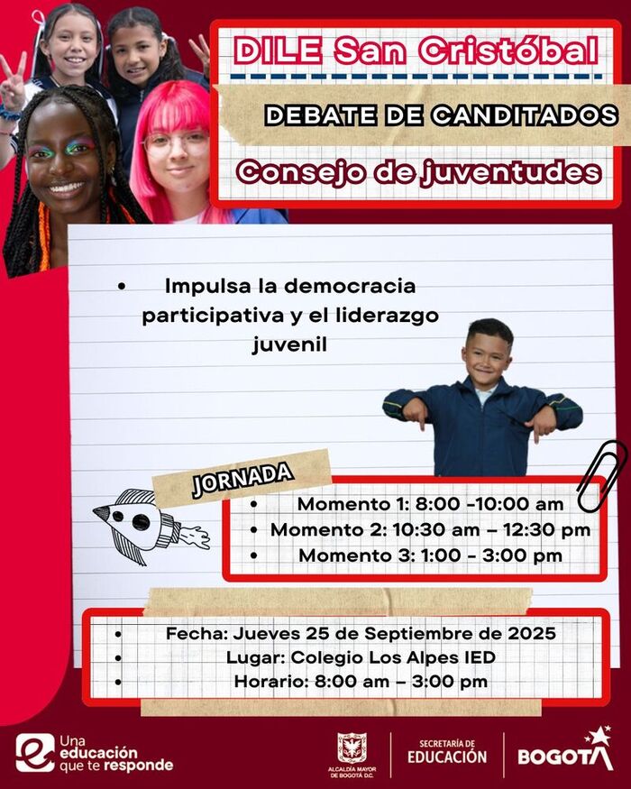 La Dirección Local de Educación de San Cristóbal invita a todos los jóvenes de la localidad a participar del Debate Pedagógico de Candidatos (as) a los Consejos de Juventud, realizado por la Registradora Nacional, que se desarrollará el 25 de septiembre de 2025, en el auditorio del Colegio Los Alpes IED dirección , en donde los candidatos(as) dispondrán de diferentes momentos clave para la socialización su plan de trabajo.