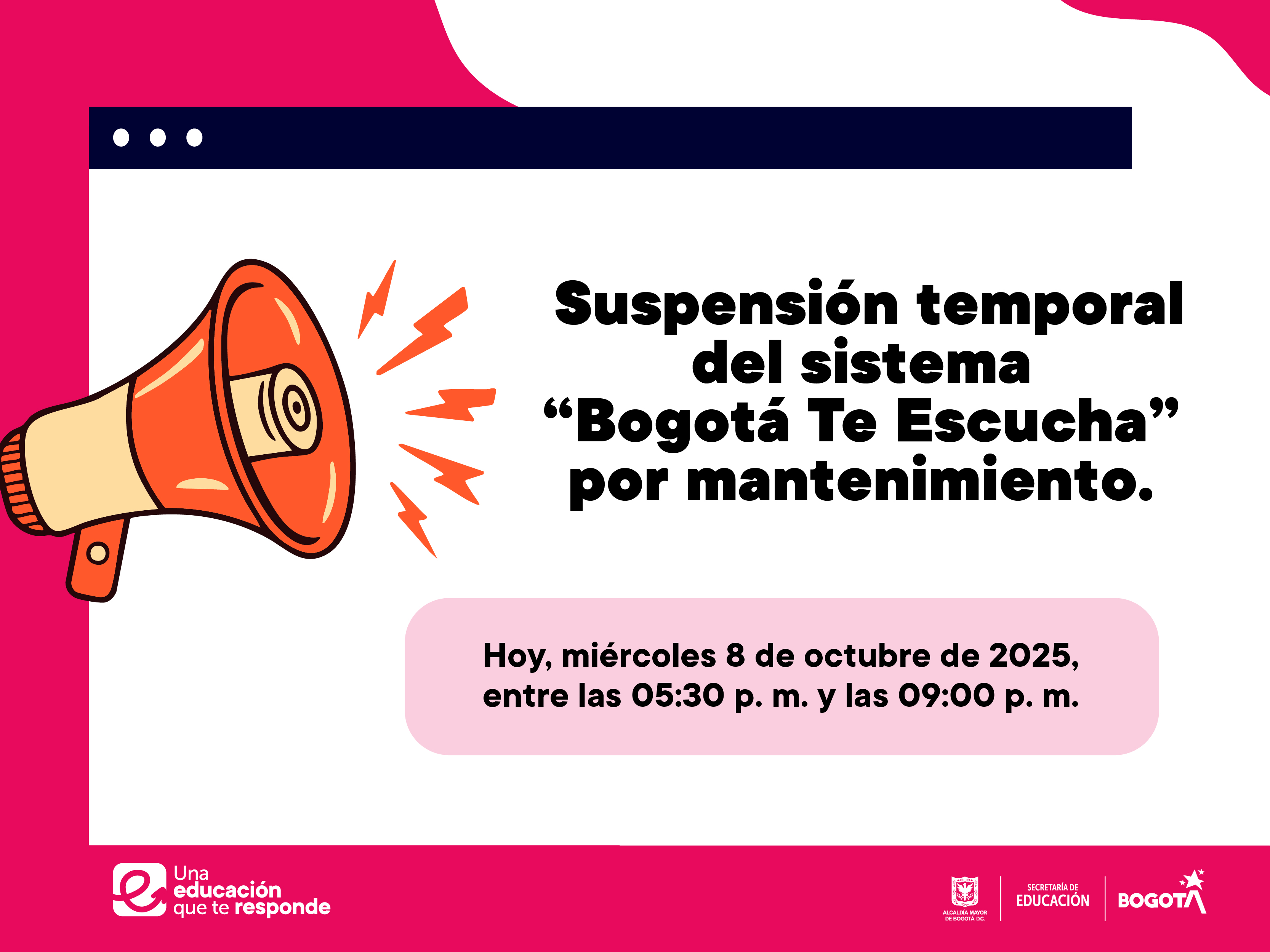 Debido a labores de mantenimiento, que se realizarán hoy, los servicios para la presentación, trámite y gestión de peticiones ciudadanas en Bogotá te Escucha estarán suspendidos.