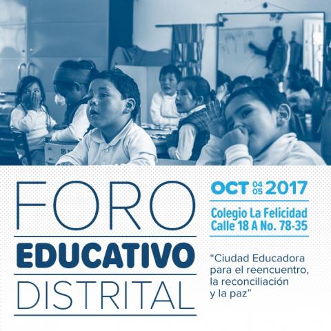Así será el Foro Educativo Distrital 2017, que se llevará a cabo los días 4 y 5 de octubre en el nuevo colegio La Felicidad: una conversación abierta para compartir y construir conocimiento, historias y acciones sobre una ciudad que educa para el reencuentro la reconciliación y la paz.