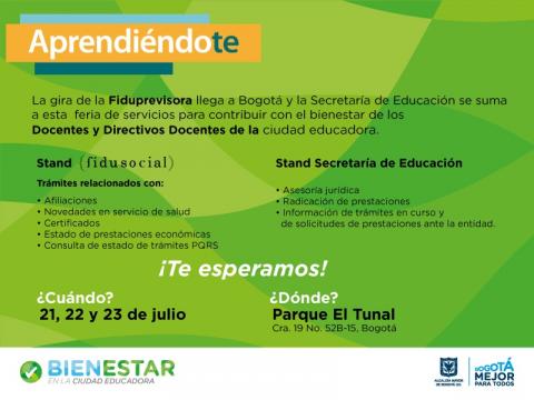 La Feria hace parte de la ‘Gira Aprendiéndote’, una jornada nacional de la Fiduprevisora con el fin de mejorar los servicios a docentes. Secretaría de Educación del Distrito participará a través de un Stand de servicios, donde maestros del Distrito contarán con: asesoría jurídica en pensiones y cesantías, radicación de prestaciones, información de trámites en curso y de solicitudes de prestaciones ante la entidad.