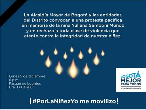 5. La Secretaría de Educación del Distrito convoca a toda la comunidad educativa a una concentración pacífica de rechazo de este hecho y de toda clase de violencia que atente contra la integridad de la niñez colombiana. La concentración será en el parque Lourdes, a partir de las 6:00 de la tarde de hoy lunes 5 de diciembre de 2016.