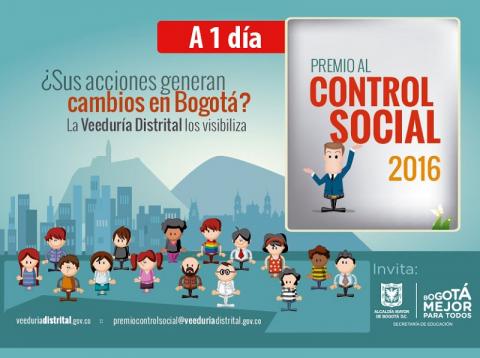Todas las organizaciones sociales así como la ciudadanía interesada en participar en el Premio al Control Social 2016, puede consultar más información en la página web www.veeduriadistrital.gov.co, escribir al correo: premiocontrolsocial@veeduriadistrital.gov.co o inscribirse aquí.