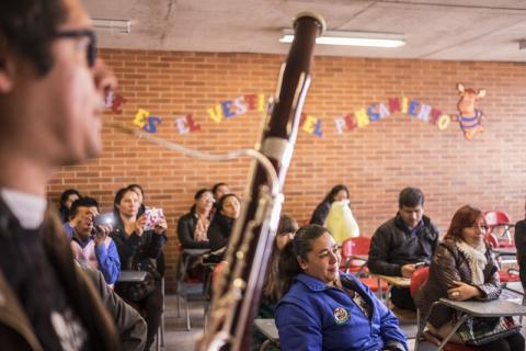 En alianza con la Orquesta Filarmónica de Bogotá (OFB), el colegio Rafael Bernal Jiménez brinda a sus estudiantes la posibilidad de profundizar en coro e interpretación de instrumentos de viento en madera y metal, percusión, cuerdas bajas y altas, entre otras opciones de educación artística y musical.