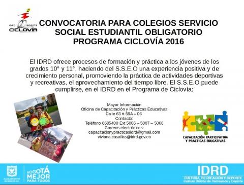 En el programa Servicio Social Estudiantil Obligatorio (S.S.E.O) Programa Ciclovía. El IDRD ofrece procesos de formación y práctica a los jóvenes de los grados 10° y 11°, haciendo del S.S.E.O una experiencia positiva y de crecimiento personal, promoviendo la práctica de actividades deportivas y recreativas, el aprovechamiento del tiempo libre. El S.S.E.O puede cumplirse, en el IDRD en el Programa de Ciclovía: