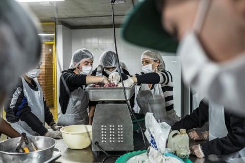Al llegar al salón de paredes blancas, que contiene en su interior tres estufas, un lavaplatos, ollas y una mesa gigante, Aída, Nemesio y diez de sus compañeros de clase, se disponen a preparar ‘salami navideño’.