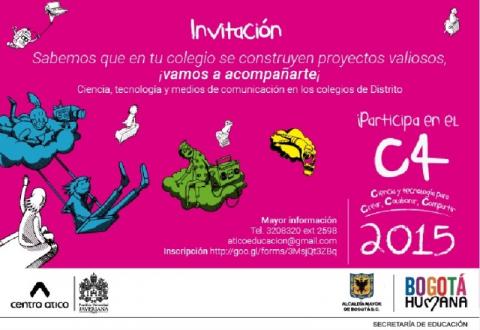 La Secretaría de Educación del Distrito invita a colegios oficiales a inscribir sus iniciativas pedagógicas enmarcadas en uso y apropiación de Tecnologías de la Información y las Comunicaciones (TIC), en el Proyecto C4: Ciencia y Tecnología para Crear, Colaborar y Compartir, realizado en convenio con el Centro Ático de la Universidad Javeriana.