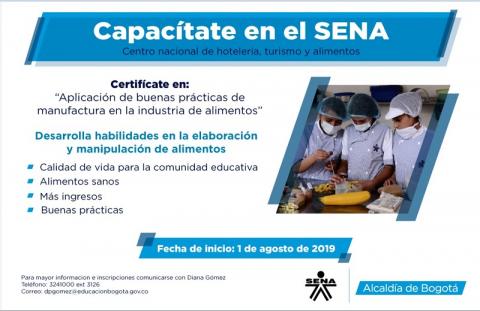 Con el fin de promover el fortalecimiento de los conocimientos y habilidades para la preparación y oferta de alimentos saludables y beneficiosos en las tiendas escolares, la Dirección de Bienestar Estudiantil de la Secretaría de Educación del Distrito adelantará con el Servicio Nacional de Aprendizaje – SENA la capacitación “Aplicación de buenas prácticas de manufactura en la industria de alimentos”.