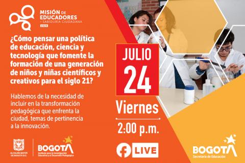 Este viernes 24 de julio, la conversación estará enfocada sobre la necesidad de incluir en la transformación pedagógica que enfrenta la ciudad temas de pertinencia a la innovación y de cómo pensar una política de educación, ciencia y tecnología que fomente la formación de una generación de niñas y niños científicos y creativos para el siglo XXI.