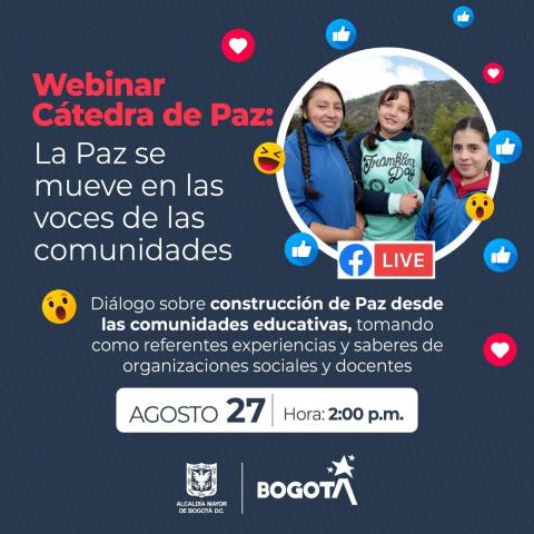 El webinar ‘Cátedra de paz: la paz se mueve en las voces de las comunidades’ se suma al propósito de hacer de Bogotá epicentro de paz y reconciliación desde un diálogo de saberes de distintas experiencias comunitarias y educativas, convocando y movilizando a niñas, niños, adolescentes y jóvenes, así como sus familias y en general a las comunidades educativas para la transformación de realidades por medio del arte y la cultura.