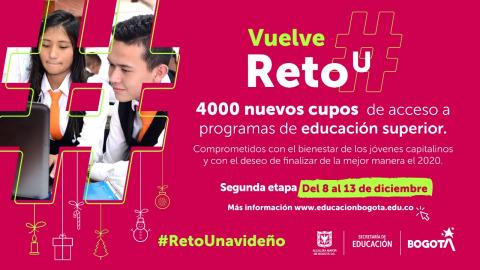 El Distrito continúa trabajando por el bienestar de los jóvenes capitalinos. Por eso, regresa #RetoALa U: el programa de inmersión en educación superior en el que los beneficiarios viven una experiencia universitaria en más de 20 Instituciones de Educación Superior que hacen parte del convenio, a través de cursos, materias, programas de extensión y de formación continua.