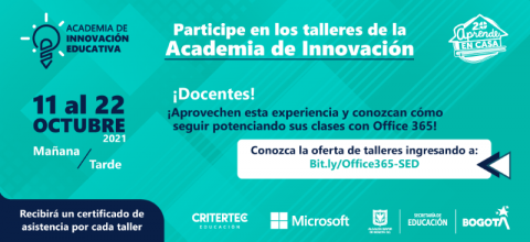 Con el fin de optimizar las clases sincrónicas apoyadas con la herramienta Microsoft, la Secretaría de Educación del Distrito en alianza con Microsoft Education y su partner Critertec organizaron los ‘Talleres de Office 365 con énfasis en Teams’, que se desarrollarán en el marco de la ‘Academia de Innovación’ de Microsoft.