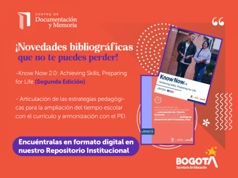 Haz clic aquí y visita el sitio web del Centro de Documentación y Memoria de la Secretaría de Educación del Distrito. Encontrarás nuestro ‘Repositorio Institucional’ con más de 3 mil publicaciones digitales que dan cuenta de la producción intelectual y editorial de nuestra Entidad, el ‘Catálogo de biblioteca’ para búsqueda de libros y otros recursos físicos existentes en el Centro de Documentación, y más información acerca de nuestros servicios.