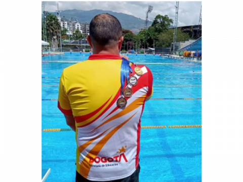 Su nombre es Javier Miguel Espinosa. Tiene 48 años, de los cuales, 38 los ha dedicado al deporte. No solo es un docente apasionado del colegio público San Agustín, de la localidad Rafael Uribe Uribe, sino un nadador profesional que ha dejado huella en esa disciplina.