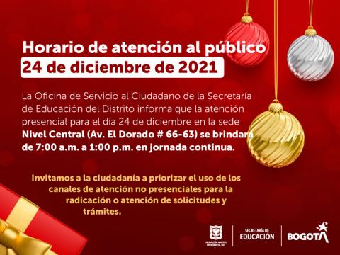 La Oficina de Servicio al Ciudadano de la Secretaría de Educación del Distrito informa que la atención presencial para el día 24 de diciembre son: