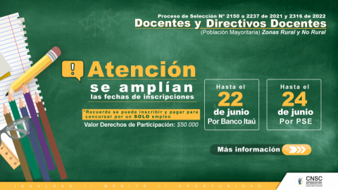 La Secretaría de Educación del Distrito se permite informar que, de acuerdo con lo establecido por la Comisión Nacional del Servicio Civil (CNSC), hasta el viernes 24 de junio se amplió el plazo para inscribirse a una de las 37.480 vacantes del proceso de selección Directivos Docentes y Docentes (población mayoritaria) Zonas Rural y No Rural.