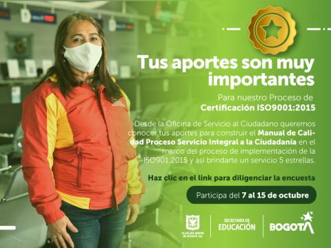 Del 7 al 15 de octubre del 2021, docentes, directivos docentes, estudiantes, familias, personal administrativo y ciudadanía en general pueden aportar sus opiniones, observaciones y sugerencias para enriquecer el proyecto de Manual de Calidad proceso Servicio Integral a la Ciudadanía de la Secretaría de Educación del Distrito.