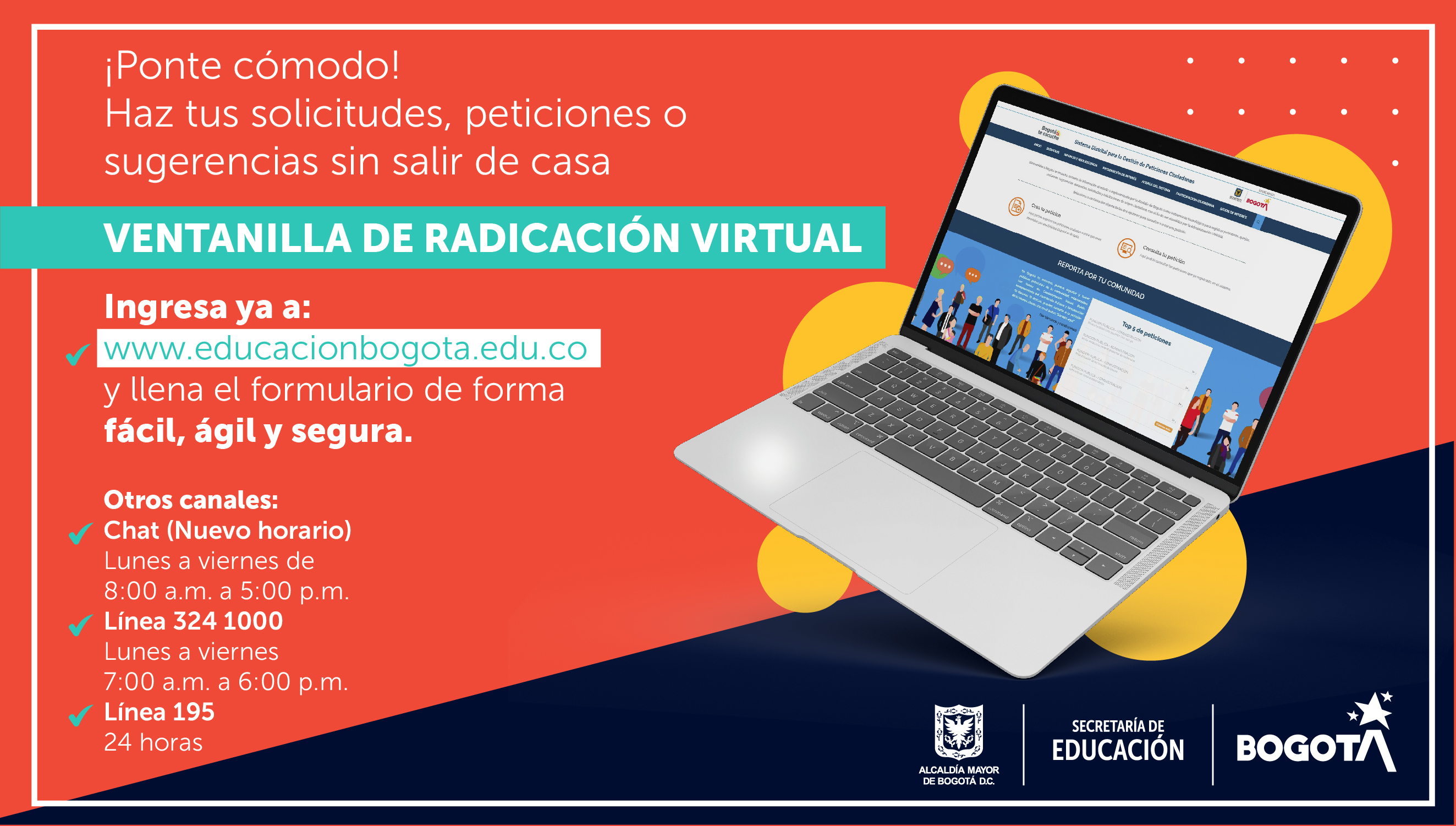 Ingresa, explora y conoce la ‘Ventanilla de Radicación Virtual’ haciendo clic aquí o a través de nuestro portal: www.educacionbogota.edu.co – servicio a la ciudadanía – Nuestros Canales de Atención.