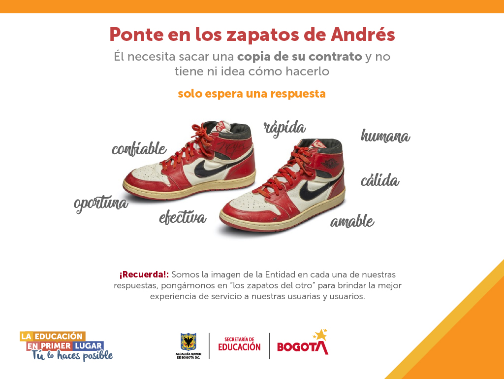 La invitación es a reflexionar en torno a la pregunta: ¿cómo te gustaría que te respondieran a ti, a tu esposa, a tu hija, hijo o padres? Es por ello que, para sensibilizar sobre la importancia de ofrecer respuestas oportunas, claras, completas y amables, a través del Sistema Integrado de Gestión y Archivo – SIGA- y el Sistema Distrital de Quejas y Soluciones (SDQS) - Bogotá Te Escucha, la Secretaría de Educación del Distrito, desde la Oficina de Servicio al Ciudadano, continúa con la promoción de la campaña ‘Ponte en los zapatos del otro’, no solo para cumplir con el deber de dar respuesta, sino de hacerlo considerando su impacto para mejorar la calidad de vida de nuestros usuarios.