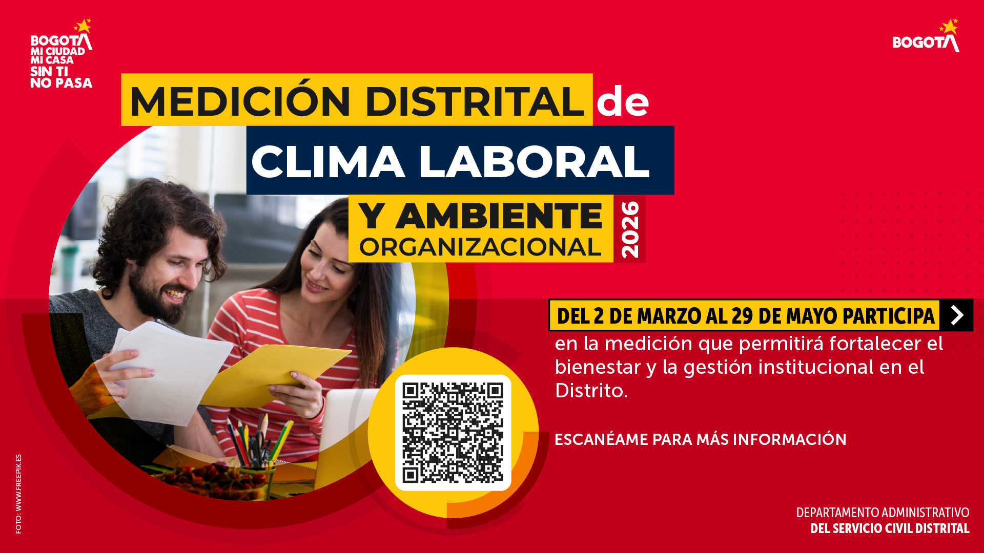 La Secretaría de Educación del Distrito invita a las y los servidores administrativos y colaboradores/contratistas de la Entidad a participar en la “Medición Distrital de Clima Laboral y Ambiente Organizacional 2026”, liderada por el Departamento Administrativo del Servicio Civil Distrital (DASCD).