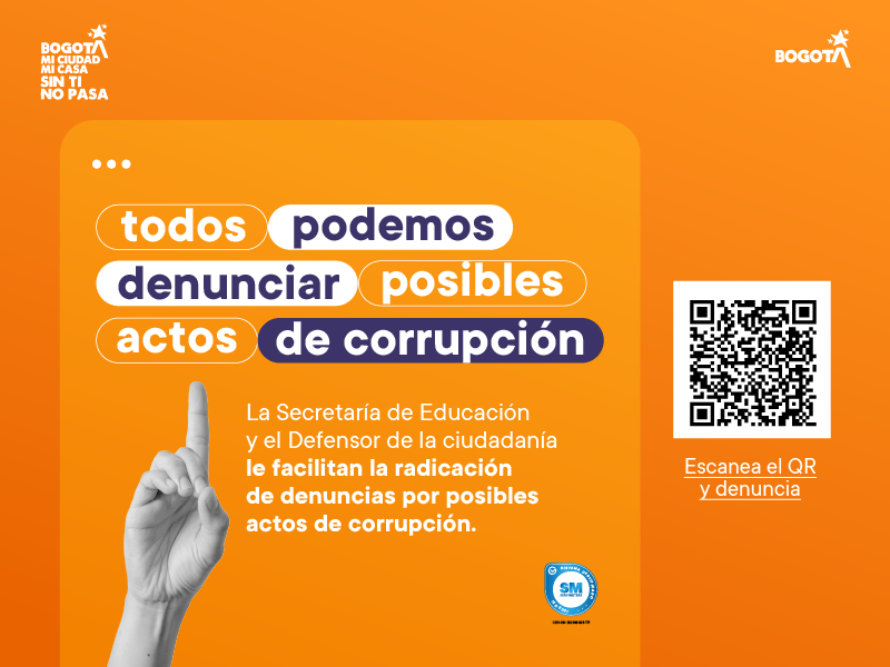 La Secretaría de Educación del Distrito - SED invita a la ciudadanía y a la comunidad educativa a reportar posibles actos de corrupción a través de sus canales oficiales. Las denuncias se pueden realizar de manera presencial, virtual o telefónica.