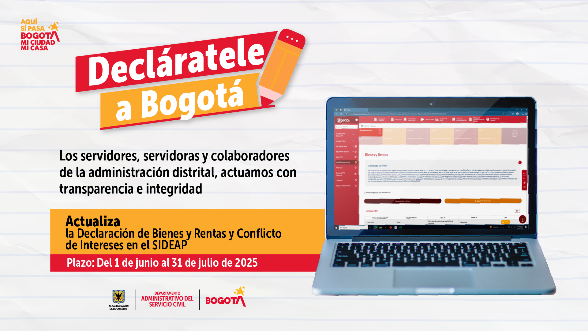 Atención servidoras y servidores públicos administrativos, docentes, directivos docentes y colaboradores de la SED: hasta el 31 de julio de 2025 hay plazo para cumplir con el DEBER de realizar la actualización de su Declaración de Bienes y Rentas y de Conflicto de interés.