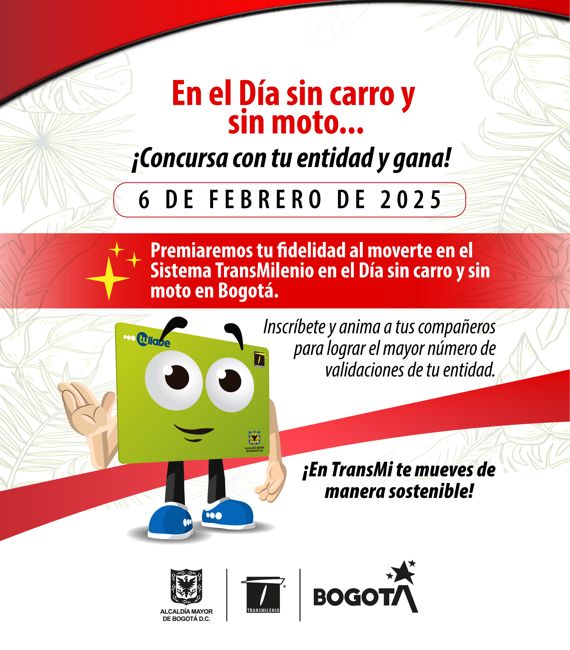 El próximo 6 de febrero, con motivo del “Día sin Carro y sin Moto”, la Secretaría General de la Alcaldía Mayor de Bogotá y TransMilenio invitan a todas las entidades distritales a sumarse al Concurso Interno Distrital, una iniciativa que reconocerá el compromiso y fidelidad con el Sistema de Transporte Público.
