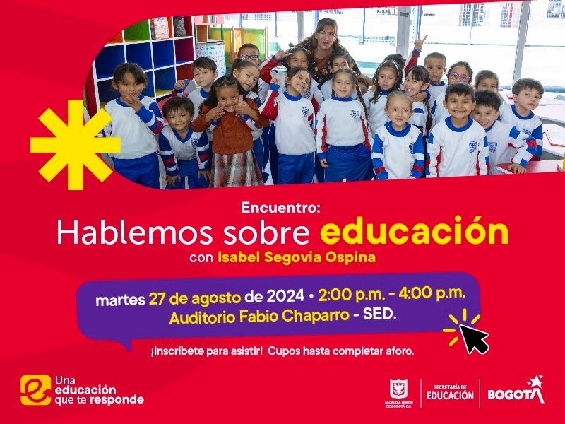 Recuerda inscribirte para asistir a este diálogo abierto, una invitación de la secretaría de Educación del Distrito, Isabel Segovia, para conversar sobre metas, acciones y retos en temas claves para avanzar en la calidad de la educación para las niñas y niños en Bogotá.