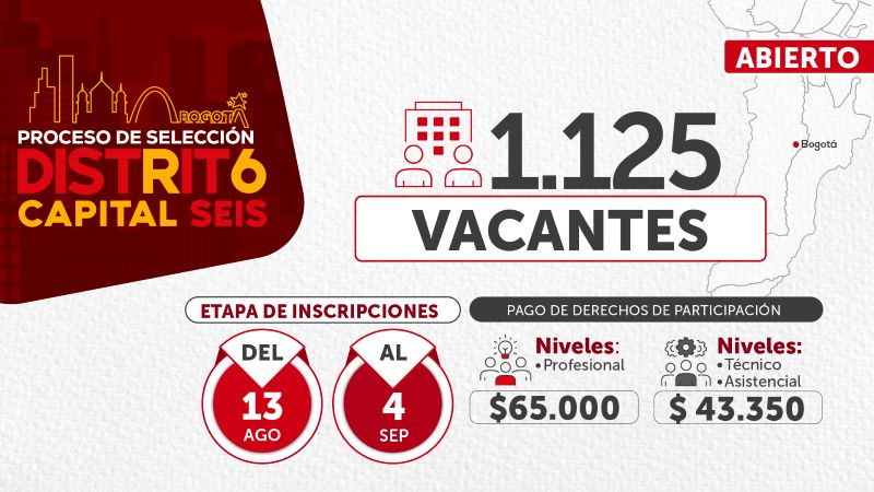 La Secretaría de Educación del Distrito expresa su comprensión y apoyo con las y los funcionarios que en los próximos días deberán enfrentar una transición profesional tras culminar su vínculo laboral con la entidad, por ello, comparte la convocatoria para el proceso de selección Distrito Capital 6, con 1.125 vacantes disponibles para servidores públicos en Bogotá.