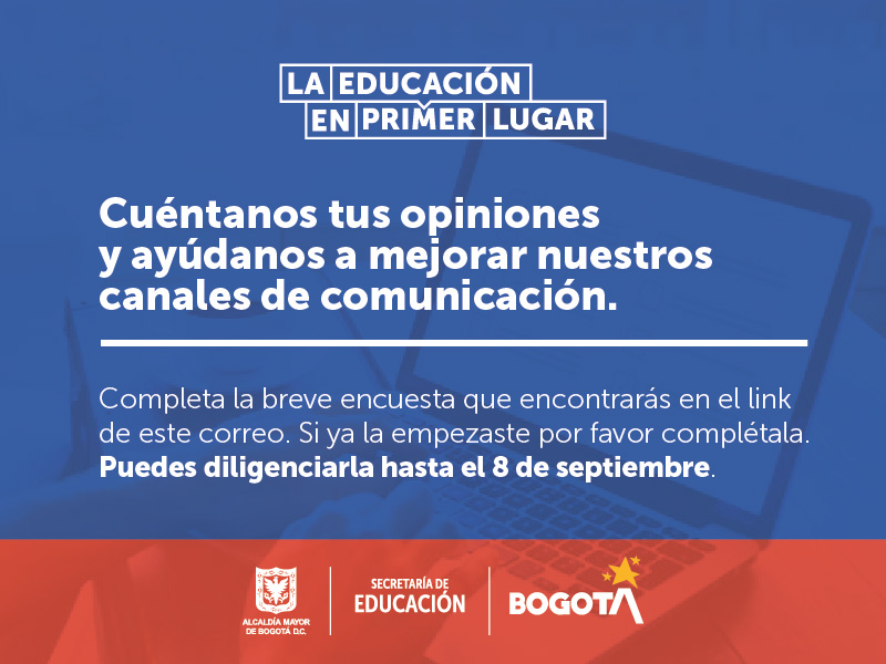 ¡Diligencia ya! la encuesta que permitirá a la SED conocer tu percepción frente al clima laboral al interior de la institución educativa en la que prestas tus servicios. Se amplió la fecha hasta el 15 de septiembre.