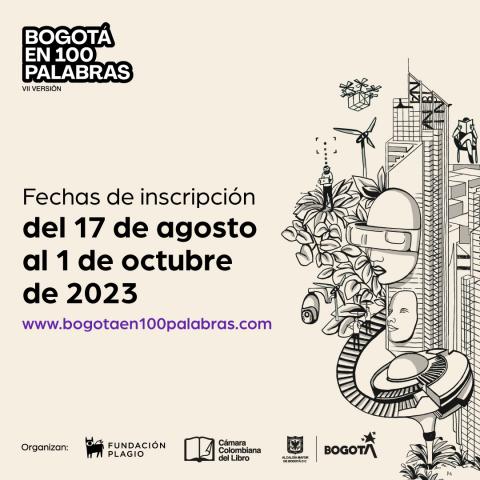 Para este 2023 llega la VII edición del concurso de relatos breves Bogotá en 100 Palabras. La invitación es a crear relatos relacionados con la temática Bogotá en 100 años. Una mirada al futuro de la ciudad representada desde la naturaleza, sus habitantes, lugares emblemáticos, calles y demás espacios que la caracterizan y hacen única.