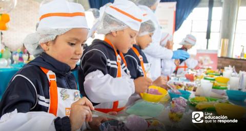 Vestidos como chefs con delantales y gorros de cocina, las niñas y niños hicieron gala de sus conocimientos y destrezas aprendidas en el programa “Cocineritos: Exploradores de un mundo de sabores”, iniciativa liderada por la Secretaría de Educación del Distrito en el marco de las estrategias pedagógicas del Programa de Alimentación Escolar (PAE) de Bogotá.