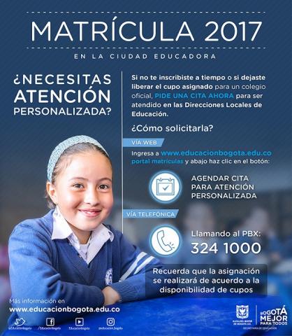 Para aquellas familias que aún no han solicitado cupo escolar para sus hijos y que todavía no tienen una cita programada para ser atendidos personalmente en las Direcciones Locales, pueden ingresar www.educacionbogota.edu.co siguiendo la ruta> Matrícula > Agendar cita para atención personalizada o a través de la línea telefónica 3241000 de la Secretaría de Educación.