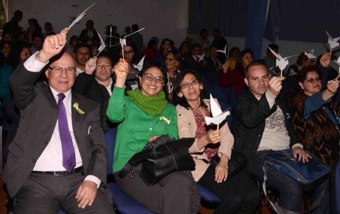 “Colombia vive uno de sus mejores momentos. La paz es una oportunidad bella, desafiante, inspiradora, pero también es un gran reto. Por eso los invito a comprometernos a vivir de una mejor manera, la cuestión de la paz empieza por uno consigo mismo, en cada familia, en cada barrio. A cada uno nos corresponde poner un granito de arena, por eso la pregunta es ¿Qué estoy dispuesto a hacer yo para aportar a la paz?”, comentó la directora Local de Educación, Yaqueline Garay.