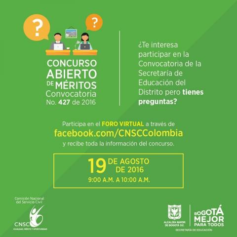 La Secretaría de Educación del Distrito y la Comisión Nacional del Servicio Civil –CNSC- invitan a todos los interesados en el concurso abierto de méritos (convocatoria 427 de 25016), a participar este viernes 19 de agosto entre las 9:00 a.m. y las 10:00 a.m. del Foro Virtual.