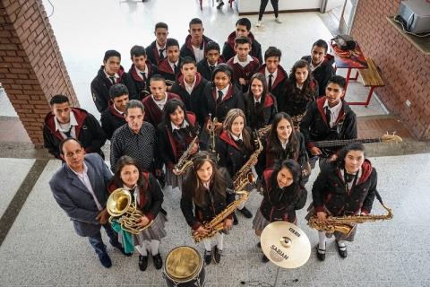 “Un, dos, tre’, cua’”, dice con entusiasmo el maestro que lleva la batuta en la orquesta del colegio Guillermo León Valencia. Saxofones, bombardinos, trompetas y trombones prenden la fiesta en el salón de ensayo, lugar en el quetodos los miércoles las asignaturas se transforman en gramática musical, técnica instrumental y ensamble.