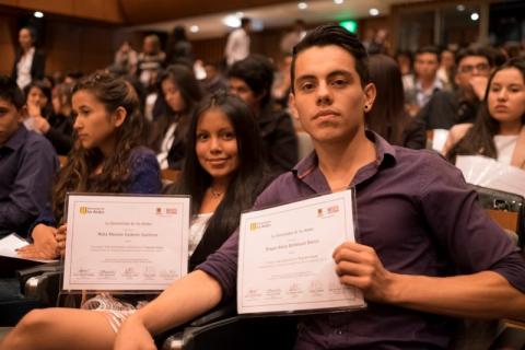 “Quiero agradecerles y decirles que nuestra universidad está muy orgullosa de que ustedes estén hoy graduándose de este programa: acaban de aprobar cursos que han tomado los mejores estudiantes de Colombia,” dijo Pablo Sanz de Santamaría, rector de la Universidad de Los Andes, en su mensaje de felicitación a los 427 estudiantes que finalizaron los estudios del programa que lanzó en mayo pasado la Secretaría de Educación en convenio con dicha universidad.