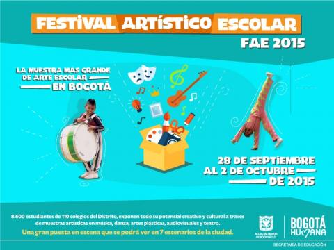 Desde el 28 de septiembre y hasta el 2 de octubre, diversos escenarios de la ciudad se llenarán de colorido y talento con motivo del ‘Festival Artístico Escolar 2015’, que presenta anualmente las experiencias más destacadas en educación artística de más de 8 mil estudiantes de 110 colegios públicos de Bogotá.