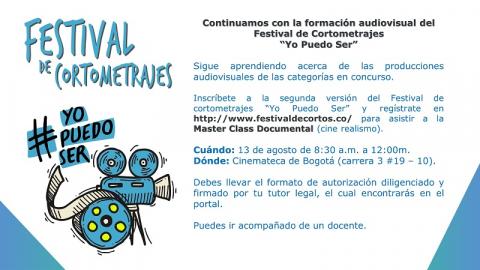 Por eso, en esta oportunidad, la entidad invita a los estudiantes de 10.º y 11.º que ya se inscribieron en el segundo festival de cortometrajes para colegios oficiales Yo Puedo Ser y que cumplen con los requisitos establecidos a que asistan al ciclo de formación audiovisual que se desarrolla en la nueva Cinemateca de Bogotá.