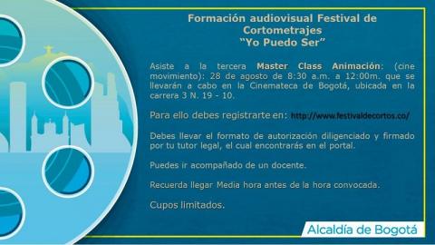 Por eso, en esta oportunidad, la entidad invita a los estudiantes de 10.º y 11.º que ya se inscribieron en el segundo festival de cortometrajes para colegios oficiales Yo Puedo Ser, y que cumplen con los requisitos establecidos, a que asistan a la tercera jornada de formación que tendrá como eje centra el cine animado o cine movimiento y que se realizará el miércoles 28 de agosto, de 8:30 a. m. a 12:00 m., en la Cinemateca de Bogotá.