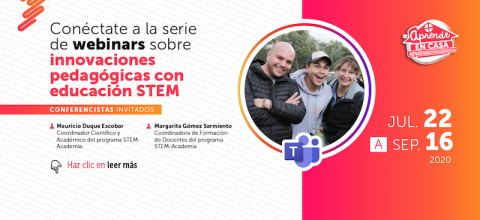 Los webinars serán también un espacio de inspiración para nuevas ideas, estrategias y herramientas pedagógicas en el desarrollo de la estrategia de flexibilización escolar ‘Aprende en casa’ y tendrán como invitados a Mauricio Duque Escobar, coordinador Científico y Académico y Margarita Gómez Sarmiento, Coordinadora de Formación de Docentes, los dos del programa STEM-Academia.