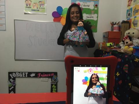 La aplicación tenía todo lo que buscaba para dinamizar sus clases. Ella usa diversos fondos de pantalla, crea personajes, baila e incita a sus estudiantes a participar en las actividades diarias de inglés.