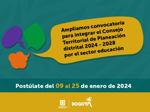 La Secretaría de Educación del Distrito extiende la convocatoria para conformar las nuevas ternas de representaciones del sector ante el Consejo Territorial de Planeación Distrital (CTPD). Las personas activas de organizaciones, asociaciones o agremiaciones educativas tendrán plazo de inscribirse hasta el 25 de enero.