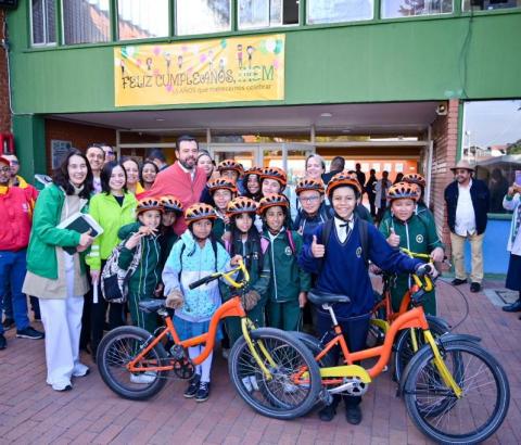La secretaria de Educación del Distrito, Isabel Segovia, en compañía de un grupo de estudiantes que se transportan en modos sostenibles destacó las estrategias que la entidad tiene en movilidad sostenible y elogió el ejemplo que dan los niños y las niñas en relación a estas iniciativas.