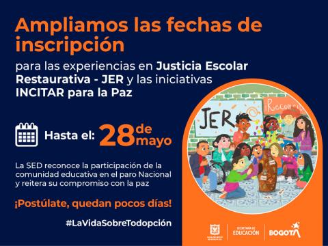 Para más información o inquietudes, escribir a los correos jer@educacionbogota.gov.co e incitarpaz@educacionbogota.gov.co