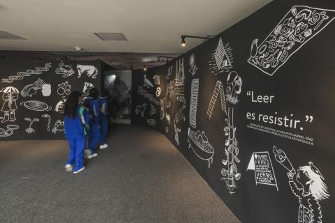 ‘Leer para la vida’ fue un espacio diseñado para que la imaginación se hiciera tangible, allí las letras abrazaban a las y los visitantes y los sonidos llevaban a mundos nuevos. Al ingresar, se encontraba una pared negra con dibujos y frases como “leer es resistir”, de un campesino de Pasquilla, en Ciudad Bolívar (sur de Bogotá), que le daban la bienvenida a niños, niñas, jóvenes y adultos.