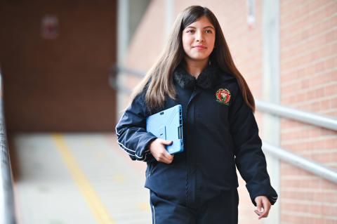 Con su cabellera larga, lacia y de color castaña se pasea por salones y pasillos con una tableta en la mano. El equipo tiene un forro color azul con un mensaje poderoso: ¡La educación en primer lugar! Katherin es una de las 115 mil estudiantes que han recibido una tableta o computador en el marco de la Ruta 100K, la estrategia con la que Bogotá está cerrando la brecha digital en la capital del país.