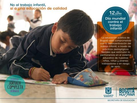Adicionalmente, la educación pública de Bogotá desarrolla desde la Dirección de Inclusión e integración de poblaciones de la Secretaría de Educación del Distrito (SED), un programa específico dirigido a la ‘Desincentivación del trabajo infantil’ desarrollado en convenios con la ‘Fundación Telefónica’ y la ‘Corporación Juntos Construyendo Futuro’, desde los cuales se estimula la permanencia de niñas, niños y jóvenes trabajadores o en riesgo de serlo, a través de prácticas pedagógicas flexibles, que garantizan procesos educativos pertinentes y diferenciales en el sistema educativo, con perspectiva de género y enfoque diferencial para una escuela libre de discriminación.