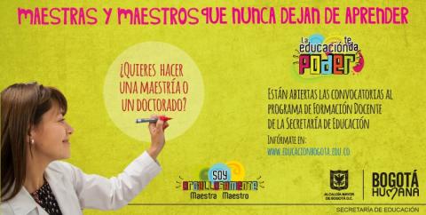 Hasta el 14 de mayo estará abierta la convocatoria con la cual la Bogotá Humana beneficia a docentes y directivos docentes del sector oficial nombrados en propiedad, para adelantar estudios de posgrado en los niveles de especialización, maestría y doctorado en el segundo semestre de 2015, con un apoyo económico del 70 % del valor de la matrícula en universidades de alta calidad.